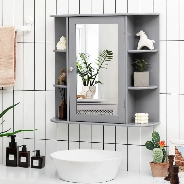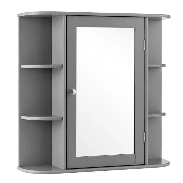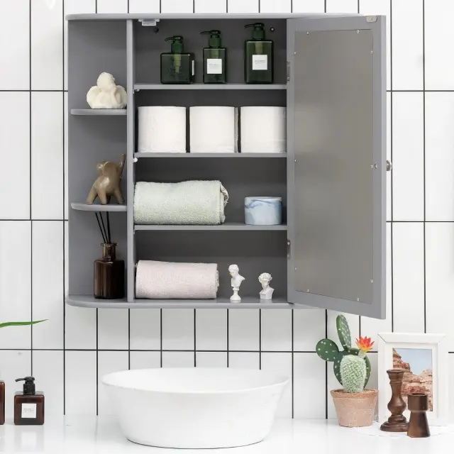 Zaradi stenske zasnove ta omarica z ogledalom ne zavzema prostora na tleh in zagotavlja dodaten prostor za shranjevanje v vaši sobi. Z odprtimi policami in omarico z zaprtimi vrati ta omarica ponuja veliko prostora za shranjevanje in izpolnjuje vaše različne zahteve. Poleg tega lahko police v omarici nastavite na 3 različne višine, da lahko vanjo namestite predmete različnih velikosti. Hkrati so vrata omarice opremljena z ogledalom visoke ločljivosti, ki je primerno za nanašanje ličil in britje. Izdelana je iz visokokakovostnega MDF, zato je struktura trdna in vzdržljiva za dolgotrajno uporabo. Kot lahko vidite, naš izdelek ponuja odlične funkcije za vaše vsakodnevne lepotne postopke.