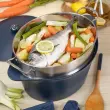S to košaro za kuhanje na pari iz nerjavečega jekla lahko pripravite okusne, lahke in zdrave obroke. Omogoča nežno in homogeno kuhanje, ki ohranja vso naravno aromo zelenjave in njene vitamine, ne da bi pri tem spremenila okus. Združljiva je z ovalno kozico Incredible Cocotte, premera 33 cm, francoske blagovne znamke Cookut. Vlijte na dno posode malo vode in košaro postavite na vrh kozice, da zagotovite nežno in enakomerno kuhanje s pomočjo pare. Zaradi vgrajenega sita se košara spremeni v kuhalnik, idealen za kuhanje zdroba in pripravo okusnega kuskusa. Uporablja se lahko pri kuhanju v dveh nivojih. Dva robustna ročaja, zagotavljata varen in udoben oprijem. Primerna je za pomivanje v pomivalnem stroju.
