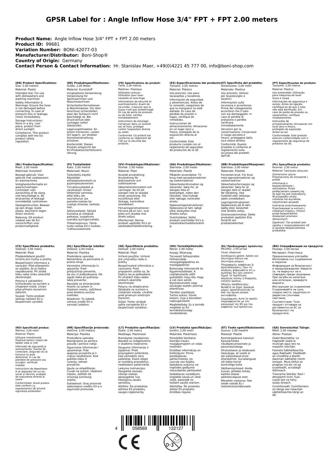 Kotna dovodna cev za pralni in pomivalni stroj, 3/4 cole, 2m, robustna in enostavna montaža