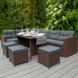 Prepustite se utelešenju razkošja z našo kotno garnituro pohištva iz ratana z 9 sedeži iz izvrstne serije JardÃ. Ta jedilna garnitura, ki jo sestavljajo kotna sedežna garnitura, 3 tabureji in steklena zgornja miza, je natančno izdelana za optimalen slog in udobje. Osupljiv črni ratan dopolnjujejo izjemno debele, čudovite sive blazine, ki vašemu vrtu dodajo sodoben in razkošen pridih. Ta komplet je zaščiten z UV plastjo in je odporen na vremenske vplive skozi vse leto, hkrati pa ohranja svojo osupljivo barvo.