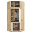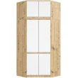 Kotna omara z zgornjim delom, omara za oblačila s šestimi vrati, je izdelana iz obrabno odporne laminirane plošče Kronospan. Telo pohištva je izdelano iz plošče v barvi umetniškega hrasta, sprednje strani pa so prekrite z laminatom v beli barvi. Omara je sestavljena iz 2 segmentov. Spodnji segment ima štiri vrata, 6 polic in palico za obešanje oblačil. Segment, ki je nameščen na vrhu, je zgornji del, zaprt z dvema vrati. Zgornji del je opremljen s 3 policami.