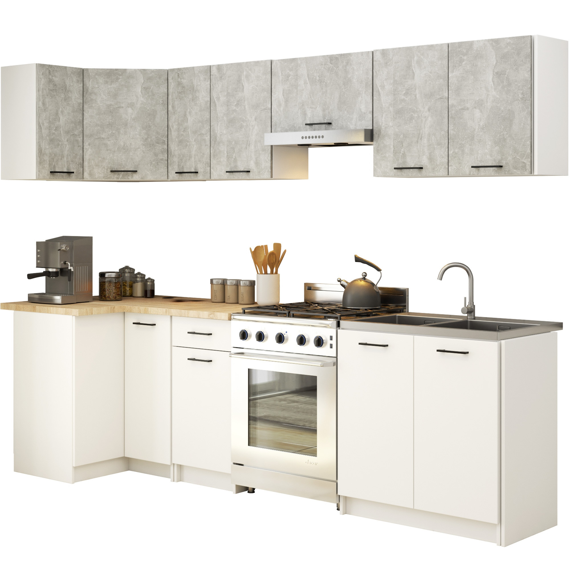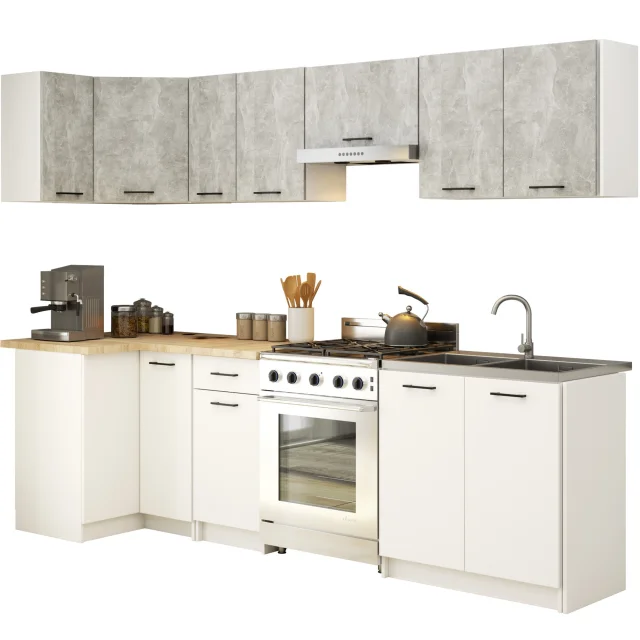 Cena velja samo za kuhinjske omare in delovno ploščo, dekorativni elementi niso vključeni v set.