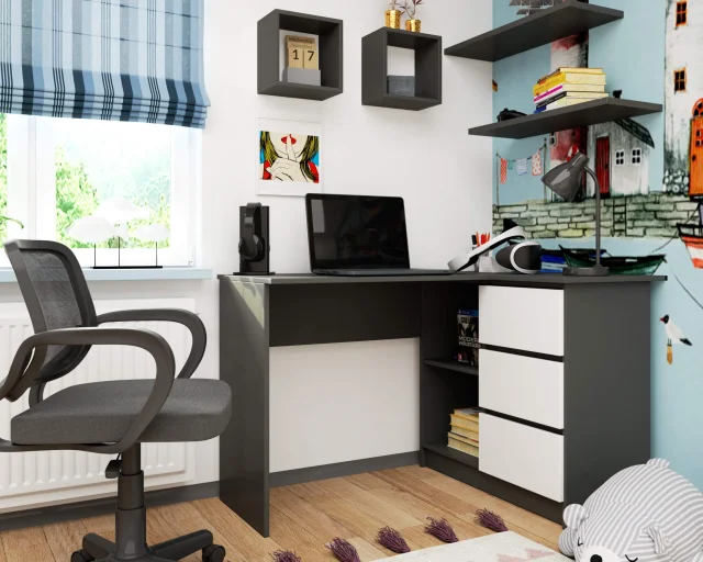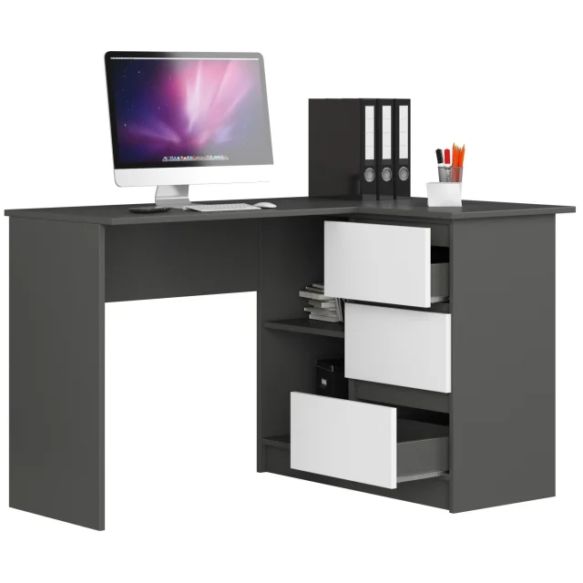 V domovih, stanovanjih in pisarnah postajajo kotne mize vse bolj pogoste. Niso le moderen, temveč tudi funkcionalne. Ljudje, ki iščejo pohištvo v sivih odtenkih z belimi sprednjimi stranmi, lahko privabi kotna miza B16, ki je široka 124 cm. Popolna je za učenje ali opravljanje poklicnih dolžnosti, hkrati pa ima sodoben videz. Vključuje police in predale, kjer lahko shranite dokumente, knjige, pisarniške potrebščine in še mnoge druge predmete. Pohištvo se odlikuje po trpežnosti. Namenjeno je samostojni sestavi, kar ni posebej težko, saj je v vsakem naročilu priložen navodila za uporabo.