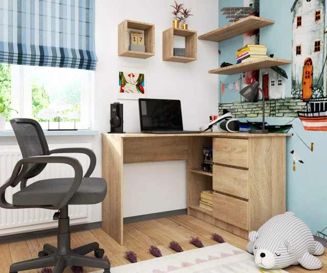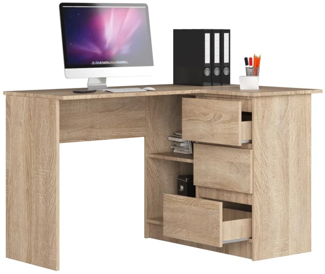 Predstavljeni model je: Kotna pisalna miza s 3 predali B16 desna sonoma hrast