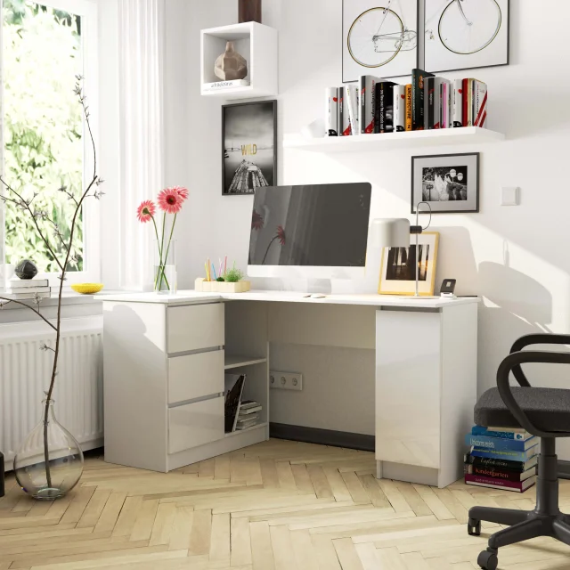 Ena od predlogov iz naše spletne trgovine je bela kotna pisalna miza za prenosni računalnik, ohranjena v modernem slogu. Sestavljena je iz treh predalov na valjčnih vodilih, dveh odprtih polic in omarice. Velik prostor na delovni površini je prav tako vredno omeniti. Bela je brezčasna barva, ki nikoli ne gre iz mode. Poleg tega se bela dobro kombinira z vsemi drugimi barvami, ustvarja pozitivno razpoloženje in vpliva na delovno učinkovitost. Zato bo predstavljeni predlog dobro deloval ne le v domači pisarni, temveč bo tudi pomagal pri organizaciji lepega, modernega pisarniškega prostora v kateri koli družbi. Ponujamo ugodno ceno za kakovosten izdelek. Vabimo vas k nakupu.