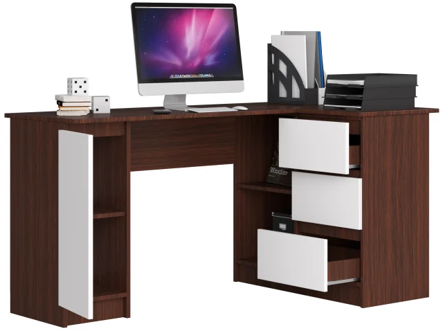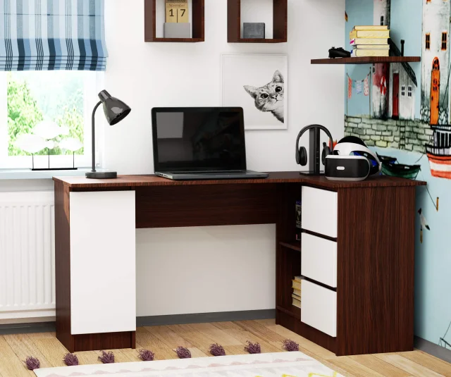 Kotni pisalni miza v barvi wenge bo zagotovo pritegnila ljubitelje klasike in elegance. Preprost v obliki, a izjemno funkcionalen, bo ta kos pohištva zelo dobro deloval predvsem v domači pisarni. Poleg tega ga lahko uporabimo v sobi študenta ali učenca, pa tudi v korporativni pisarni. Njegova trdna konstrukcija iz visokokakovostne laminirane plošče, ki kaže odlično odpornost in trajnost, si zasluži pozornost. Kotni pisalni miza je odlična rešitev, namenjena predvsem tistim, ki opremljajo majhne prostore. Predlagana rešitev je kombinacija telesa v barvi wenge z belimi frontami. Celota je enostavna za čiščenje in izgleda čudovito v vsakem prostoru. Če iščete trden in skrbno izdelan kos pohištva, ki vas bo pozitivno presenetil s svojo funkcionalnostjo, modernim dizajnom, pozornostjo do podrobnosti in vam bo omogočil, da najdete prostor za vse potrebne pisarniške potrebščine in dodatke, vas spodbujamo, da izkoristite ponudbo, ki smo jo pripravili.
