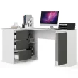 B20 155 cm LEVO kotno pisalno mizo v beli / grafitno sivi barvi je eleganten kos pisarniškega pohištva s sodobnim dizajnom. To bo odlična izbira za domače pisarne in otroške sobe. Kotno mizo je mogoče umestiti v razporeditev prostora, kar ustvarja pravi prostor za delo in učenje. S predali, policami in omarico, razporejenimi na obeh straneh mize, bodo potrebni predmeti na dosegu roke. Prav tako je enostavno organizirati dokumente, knjige ali pisarniške potrebščine, ki se lahko prilegajo v prostorne predale, ki se premikajo na valjčnih vodilih. Miza je izdelana iz 16 mm laminirane plošče Kronospan, ki je odporna na obrabo, kar zagotavlja, da nam bo miza dolgo služila. Robovi pohištva so pokriti z ABS robom, kar zagotavlja odpornost proti mehanskim poškodbam mize.