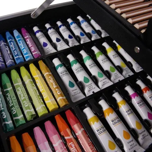 RED MORA BITI - ko odprete kovček, boste našli številne kakovostne umetniške materiale, skrbno urejene in zavarovane v za to namenjenih predalih. Tako boste lažje vzdrževali svoje zaloge čiste in pospravljene, ne da bi vas skrbelo, da bi poškodovali ali zlomili svoje najljubše barvice. Likovni set ima za vsakogar nekaj - barvna pisala , risalne barvice in barve . Vse to v nasičenih barvah, ki odlično izgledajo na papirju ali platnu.