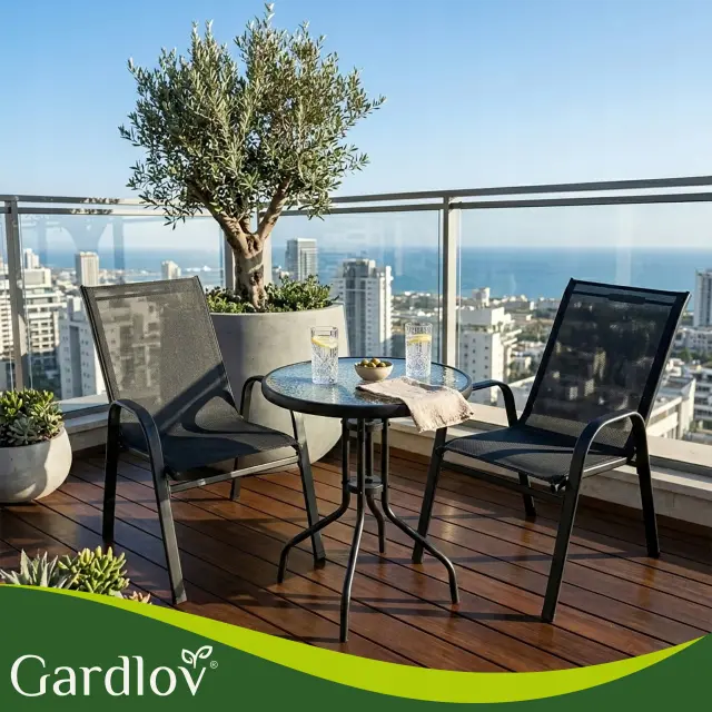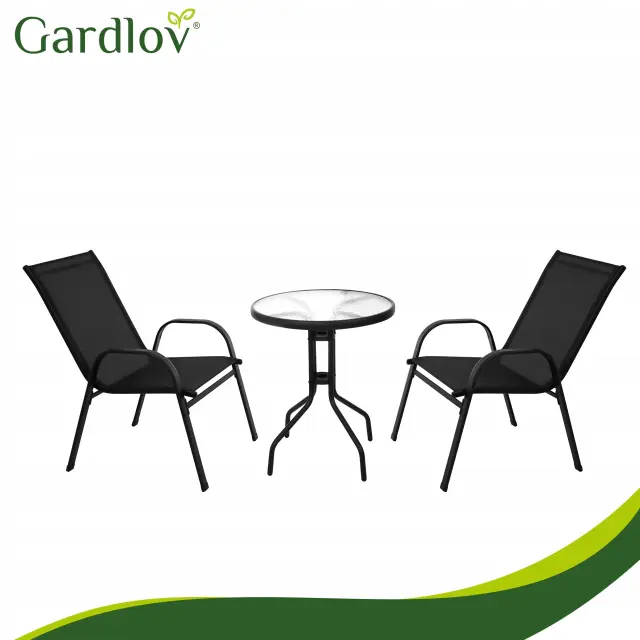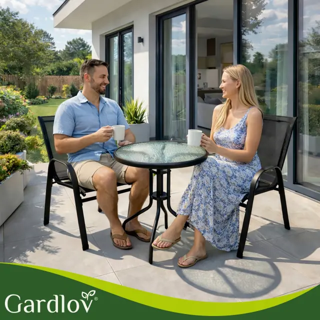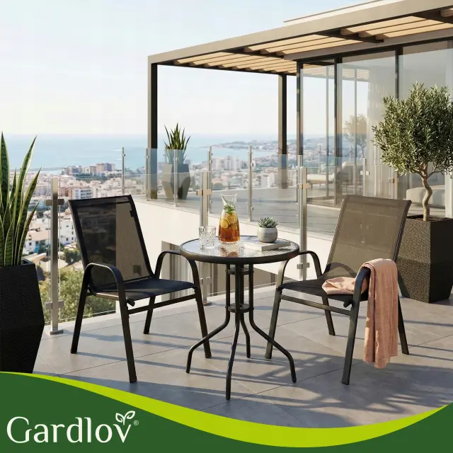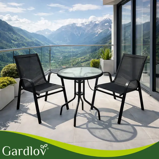 Ustvarite svoj najljubši kotiček za jutranjo kavo! Ta 3-delni set združuje brezčasen dizajn črne kovine in sodoben videz kaljenega stekla. Garnitura je zasnovana tako, da zavzame minimalno prostora, hkrati pa nudi maksimalno udobje. Stabilna miza z močnim kovinskim ogrodjem in površino iz teksturiranega stekla je odporna na praske, stola s trpežno mrežasto tkanino (textilene) pa omogočata udobno sedenje brez potrebe po dodatnih blazinah, saj material “diha”.