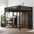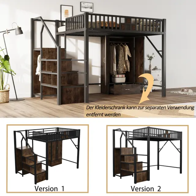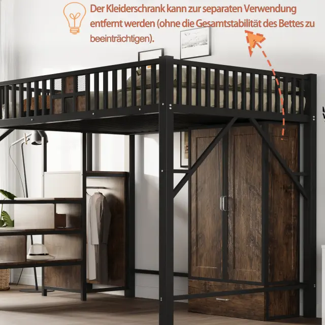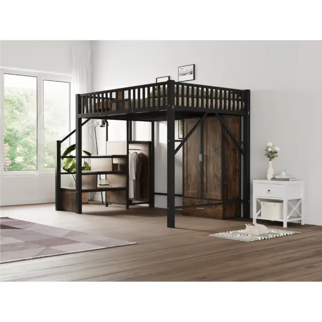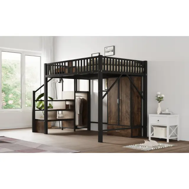 Kovinska podstrešna postelja 140x200 cm z omaro, predali in lestvijo za shranjevanje, črna