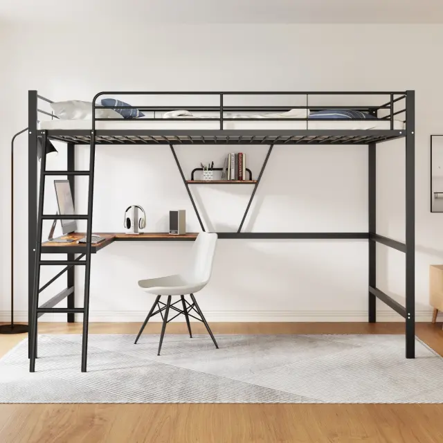 Kovinska podstrešna postelja 90x200 cm z L-oblikovano mizo in polico, črna