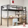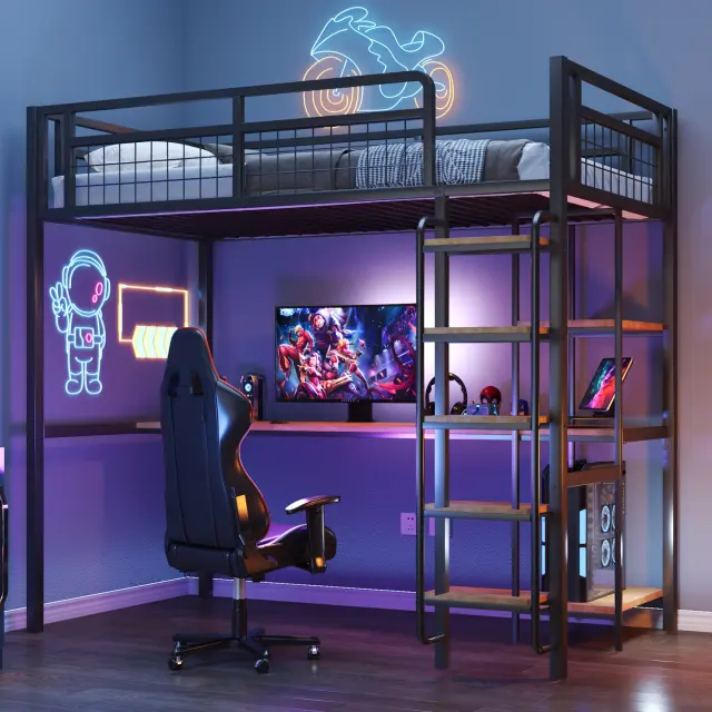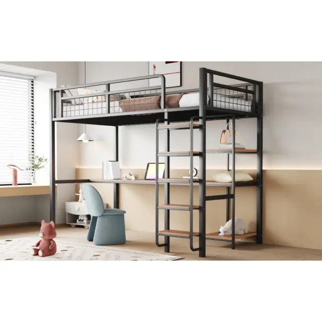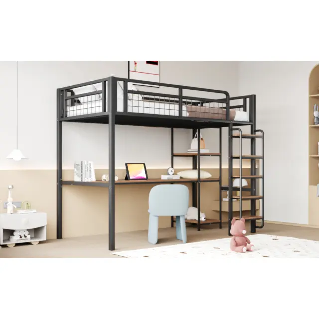 Ta kovinska podstrešna postelja ponuja optimalen prostor za spanje, delo in shranjevanje. Ima varno kovinsko ograjo, trdno lestev ter integrirano mizo in police. Na voljo je v beli ali črni barvi.