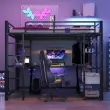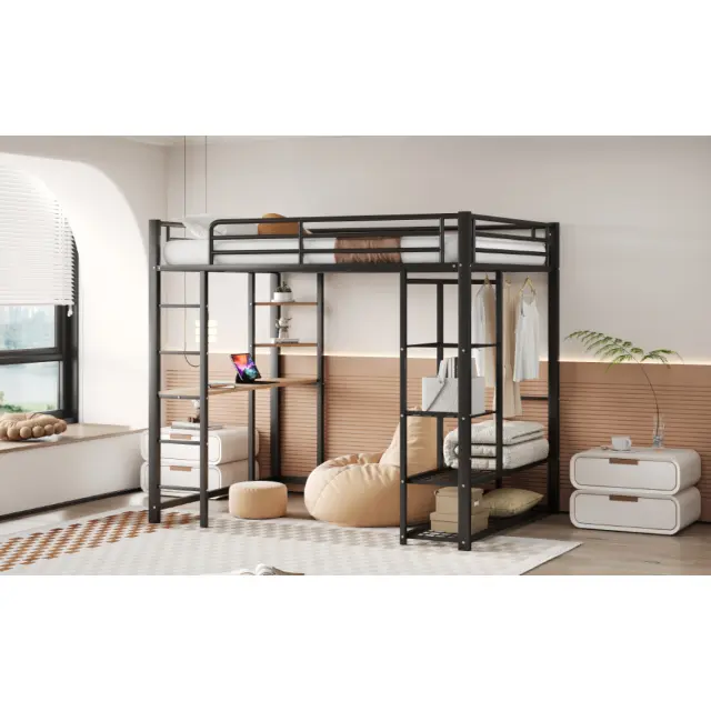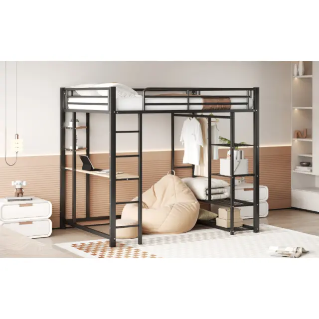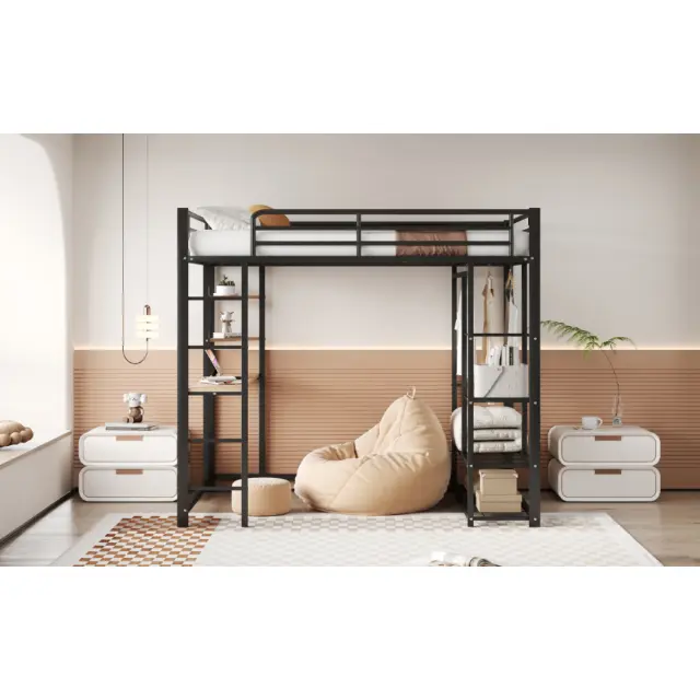 Kovinska podstrešna postelja z lestvijo 140x200 cm, zakonska postelja z mizico, črna