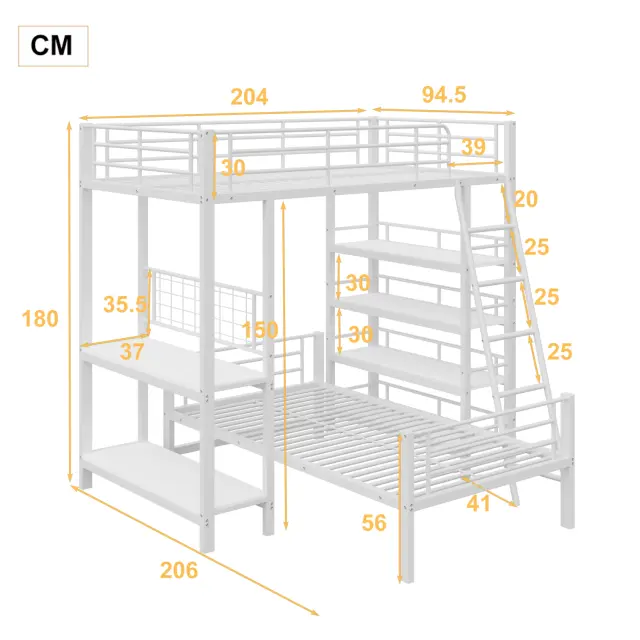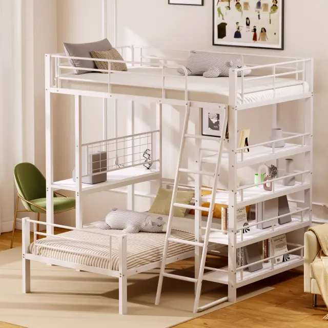 Kovinska pogradna postelja 90x200 s policami, bela