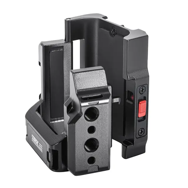 Obsežna združljivost: Kletka ima na levi strani nastavek za hladno čevelj za pritrditev mikrofonov, dopolnilnih luči, držal za telefon in drugega. 1/4-palčna luknja za vijak na desni omogoča namestitev stojal, palic za selfije (brez vpliva na navpično fotografiranje) in drugih dodatkov.