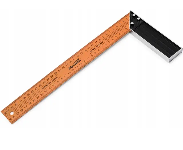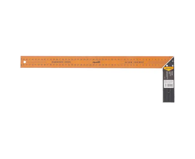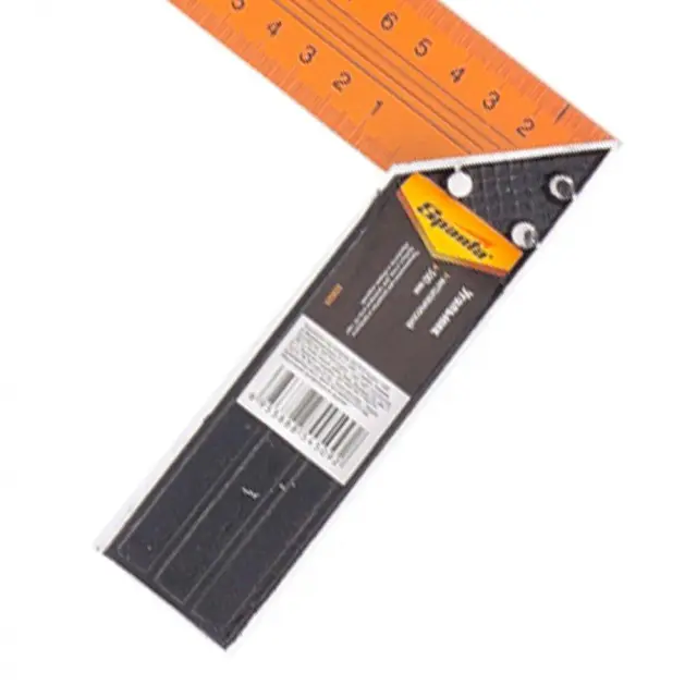 Univerzalni kovinski mizarski kotnik z barvano površino in dvostranskimi oznakami. Zasnovan za označevanje in preverjanje pravih kotov ter preverjanje kotov 45 stopinj med obdelavo in montažo izdelka.