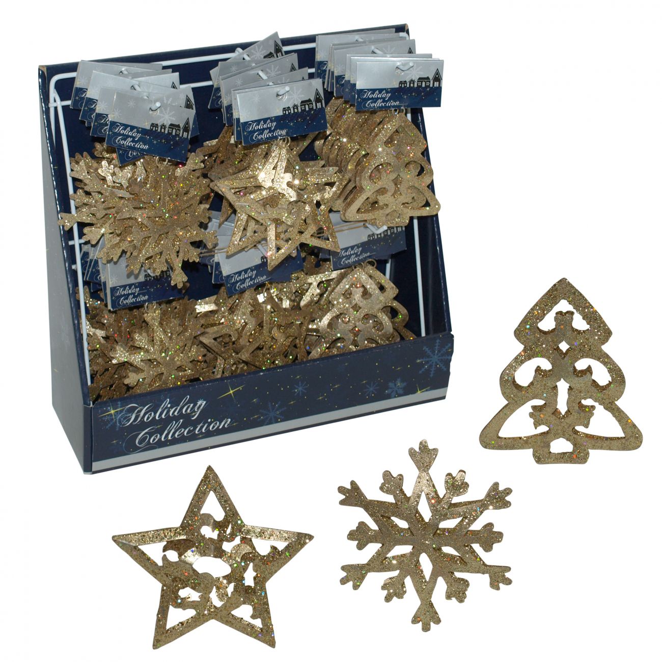 Okraski za smrekico. Kovinski, v zlati barvi. 3 vrste: snežinka 9,5x9,5x1,5 cm, zvezda 9,5x9,5x1,5 cm, smrekica 10x8x1,5 cm. 48 kosov v škatli - display-u.
