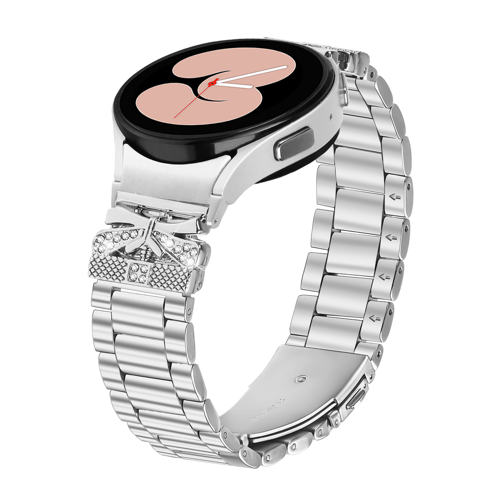 Elegantno nerjaveče jeklo: Ta pašček za uro, izdelan iz visokokakovostnega nerjavečega jekla, izžareva prefinjeno eleganco in doda pridih prefinjenosti vašemu vsakdanjemu videzu. Poliran srebrn zaključek dopolnjuje sodoben videz vaše ure Galaxy Watch.
