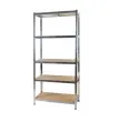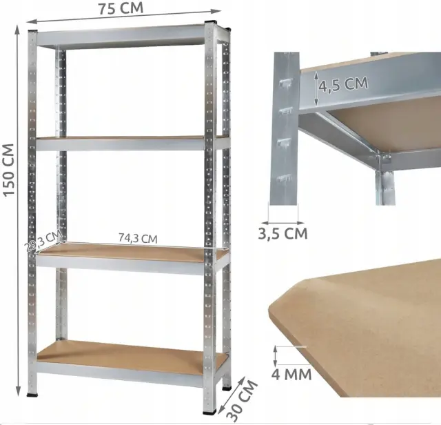 SPECIFIKACIJA – mere regala (višina / širina / globina): 150/75 / 30cm; mere police (širina / dolžina): 74,3 / 29,3 cm; maks. obremenitev na polico: 135 kg (skupaj 540 kg za celoten regal); število polic: 4; materiali: 0,8 mm pocinkano jeklo, 4 mm MDF plošča; montaža: brez vijakov (vtisnjene prečke); teža: ~ 11 kg.