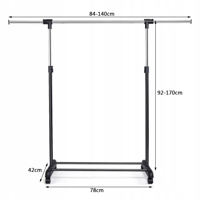 Praktično stojalo za oblačila lahko zaradi kolesc z gladkim tekom hitro in preprosto premaknete na primerno mesto. Stojalo za oblačila je neskončno nastavljivo v navpični in vodoravni smeri ter se lahko uporablja za obešanje srajc in plaščev.
