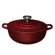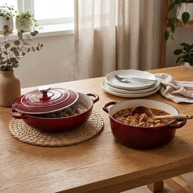 Posoda iz litega železa Maxwell & Williams združuje brezčasno eleganco in vrhunsko funkcionalnost, ki navduši tako pri kuhanju kot pri postrežbi. Izdelana je iz kakovostnega avstralskega litega železa, ki zagotavlja izjemno zadrževanje toplote in enakomerno porazdelitev, njena emajlirana notranjost pa omogoča enostavno čiščenje ter preprečuje prijemanje hrane. Zasnovana je za vsestransko uporabo – primerna za vse vrste kuhalnih površin, vključno z indukcijo, ter za uporabo v pečici (do 200 °C) in neposredno na mizi. Tesno prilegajoč se pokrov s kondenzacijskimi vozlički poskrbi, da se vlaga enakomerno vrača nazaj na jed, kar ohranja sočnost, bogat okus in popolno teksturo vsakega obroka. Model Merlot s premerom 24 cm in prostornino 3,3 l je idealen za pripravo enolončnic, pečenk in drugih počasi kuhanih jedi. Bordo odtenek doda kuhinji pridih prefinjenosti, hkrati pa trpežna izdelava zagotavlja dolgo življenjsko dobo. Posoda je zapakirana v lični darilni škatli, zato je odlična izbira za darilo ali razvajanje domače kuhinje. Ni primerna za uporabo v mikrovalovni pečici in pomivanje v pomivalnem stroju. Pri prenašanju posode vedno uporabite debelo kuhinjsko krpo ali kuhinjske rokavice.