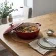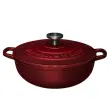 Posoda iz litega železa Maxwell & Williams združuje brezčasno eleganco in vrhunsko funkcionalnost, ki navduši tako pri kuhanju kot pri postrežbi. Izdelana je iz kakovostnega avstralskega litega železa, ki zagotavlja izjemno zadrževanje toplote in enakomerno porazdelitev, njena emajlirana notranjost pa omogoča enostavno čiščenje ter preprečuje prijemanje hrane. Zasnovana je za vsestransko uporabo – primerna za vse vrste kuhalnih površin, vključno z indukcijo, ter za uporabo v pečici (do 200 °C) in neposredno na mizi. Tesno prilegajoč se pokrov s kondenzacijskimi vozlički poskrbi, da se vlaga enakomerno vrača nazaj na jed, kar ohranja sočnost, bogat okus in popolno teksturo vsakega obroka. Model Merlot s premerom 26 cm in prostornino 4 l je idealen za pripravo enolončnic, pečenk in drugih počasi kuhanih jedi. Bordo odtenek doda kuhinji pridih prefinjenosti, hkrati pa trpežna izdelava zagotavlja dolgo življenjsko dobo. Posoda je zapakirana v lični darilni škatli, zato je odlična izbira za darilo ali razvajanje domače kuhinje. Ni primerna za uporabo v mikrovalovni pečici in pomivanje v pomivalnem stroju. Pri prenašanju posode vedno uporabite debelo kuhinjsko krpo ali kuhinjske rokavice.