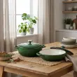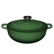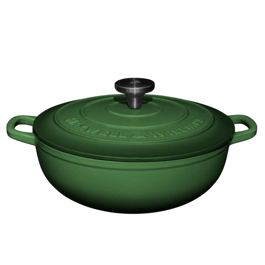 Posoda iz litega železa Maxwell & Williams združuje brezčasno eleganco in vrhunsko funkcionalnost, ki navduši tako pri kuhanju kot pri postrežbi. Izdelana je iz kakovostnega avstralskega litega železa, ki zagotavlja izjemno zadrževanje toplote in enakomerno porazdelitev, njena emajlirana notranjost pa omogoča enostavno čiščenje ter preprečuje prijemanje hrane. Zasnovana je za vsestransko uporabo – primerna za vse vrste kuhalnih površin, vključno z indukcijo, ter za uporabo v pečici (do 200 °C) in neposredno na mizi. Tesno prilegajoč se pokrov s kondenzacijskimi vozlički poskrbi, da se vlaga enakomerno vrača nazaj na jed, kar ohranja sočnost, bogat okus in popolno teksturo vsakega obroka. Model English Racing Green s premerom 26 cm in prostornino 4 l je idealen za pripravo enolončnic, pečenk in drugih počasi kuhanih jedi. Zelen odtenek doda kuhinji pridih prefinjenosti, hkrati pa trpežna izdelava zagotavlja dolgo življenjsko dobo. Posoda je zapakirana v lični darilni škatli, zato je odlična izbira za darilo ali razvajanje domače kuhinje. Ni primerna za uporabo v mikrovalovni pečici in pomivanje v pomivalnem stroju. Pri prenašanju posode vedno uporabite debelo kuhinjsko krpo ali kuhinjske rokavice.
