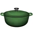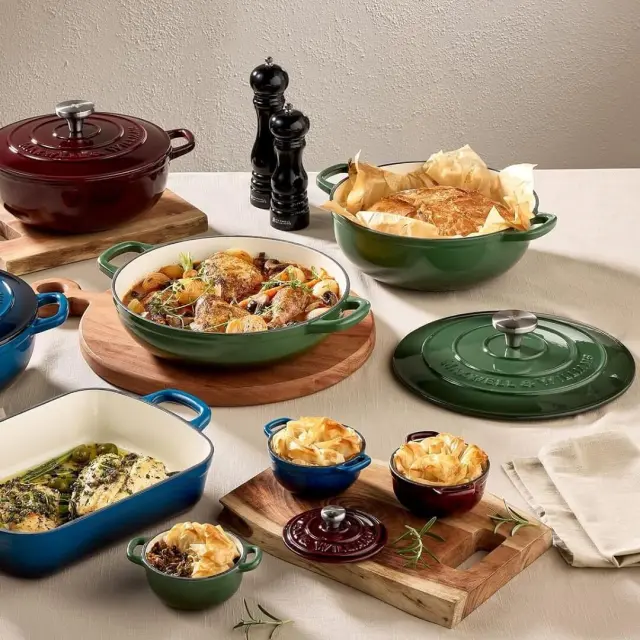 Posoda iz litega železa Maxwell & Williams združuje brezčasno eleganco in vrhunsko funkcionalnost, ki navduši tako pri kuhanju kot pri postrežbi. Izdelana je iz kakovostnega avstralskega litega železa, ki zagotavlja izjemno zadrževanje toplote in enakomerno porazdelitev, njena emajlirana notranjost pa omogoča enostavno čiščenje ter preprečuje prijemanje hrane. Zasnovana je za vsestransko uporabo – primerna za vse vrste kuhalnih površin, vključno z indukcijo, ter za uporabo v pečici (do 200 °C) in neposredno na mizi. Tesno prilegajoč se pokrov s kondenzacijskimi vozlički poskrbi, da se vlaga enakomerno vrača nazaj na jed, kar ohranja sočnost, bogat okus in popolno teksturo vsakega obroka. Model English Racing Green s premerom 28 cm in prostornino 6,2 l je idealen za pripravo enolončnic, pečenk in drugih počasi kuhanih jedi. Zelen odtenek doda kuhinji pridih prefinjenosti, hkrati pa trpežna izdelava zagotavlja dolgo življenjsko dobo. Posoda je zapakirana v lični darilni škatli, zato je odlična izbira za darilo ali razvajanje domače kuhinje. Ni primerna za uporabo v mikrovalovni pečici in pomivanje v pomivalnem stroju. Pri prenašanju posode vedno uporabite debelo kuhinjsko krpo ali kuhinjske rokavice.