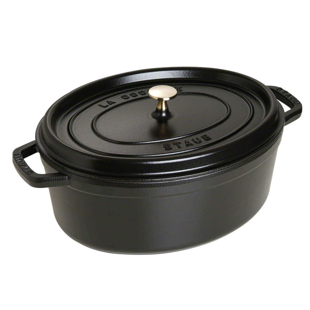 Ovalna specialna kozica Cocotte Black, znamke Staub, dolžine 38 cm (brez ročajev 30,5 cm), širine 25 cm, višine brez pokrova 12 cm in prostornine 5,5 l, je izdelana iz emajliranega litega železa. Izdelki Staub so izdelani iz zelo kakovostnega litega železa s povečano odpornostjo proti praskam in krušenju. So enostavni za čiščenje in z dolgo življenjsko dobo. Zaradi uporabljenih materialov posode za kuhanje ohranijo svojo temperaturo in ostanejo tople še dolgo potem, ko jih vzamemo iz pečice ali odstranimo s kuhalne plošče. Poleg teh tehničnih lastnosti njihov privlačen videz omogoča serviranje hrane na mizo, neposredno iz posode, takoj ko jo vzamete s kuhalne plošče. Emajlirano lito železo je prav tako idealno za poudarjanje arome živil in daje jedem značilen okus. Cocotte je opremljena z ravnim pokrovom z inovativno strukturo na spodnji strani, ki zbira kondenz med kuhanjem in enakomerno kaplja na hrano. Ta neprekinjen cikel zagotavlja ohranjanje naravnega okusa hrane in njene hranilne vrednosti, vlaga ne uhaja iz lonca – kuhanje v lastnem soku. Rezultat je vrhunska okusna hrana za dušo. Dodatna tekočina torej ni potrebna. Dvojni ročaj omogoča enostavno rokovanje in prenašanje. Posoda izvira iz Francije in je idealna za pripravo okusnih receptov, od golaža, rib, zelenjave do ratatuja. Idealna je za peko in počasno pečenje pečenk in celih piščancev. Zahvaljujoč mat črnemu emajlu v notranjosti posode, se med dušenjem in kuhanjem nič ne zažge. Notranjo matirano plast Staub proizvaja s posebnimi tehnologijami, ki nudijo prednosti pri tehnikah kuhanja, kot so dušenje, pečenje ali karamelizacija. Olja (maščobe), uporabljena med kuhanjem, bodo prodrla v pore mat emajla in ustvarila gladko naravno površino proti prijemanju. Zato je posoda Staub z leti, ko jo uporabljate, vedno boljša. Na zunanji strani ima vsaj 2-3 plasti posebnega emajla, ki v kombinaciji z litim železom zagotavlja optimalno porazdelitev toplote po celotni površini posode. Visokokakovosten emajl je odporen na praske in temperaturne šoke ter enostaven za nego. Kozica je primerna za začetnike, hobi kuharje in profesionalce. Cenijo jih celo kuharski mojstri, kot je Paul Bocuse, in jih lahko uporabljate na steklokeramični kuhalni plošči, plinski kuhalni plošči, indukcijski plošči ali v pečici. Poleg tega vsestranski Cocotte Black daje poseben čar tako vaši kuhinji kot jedilnici. Pomijte ročno.