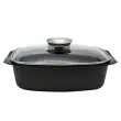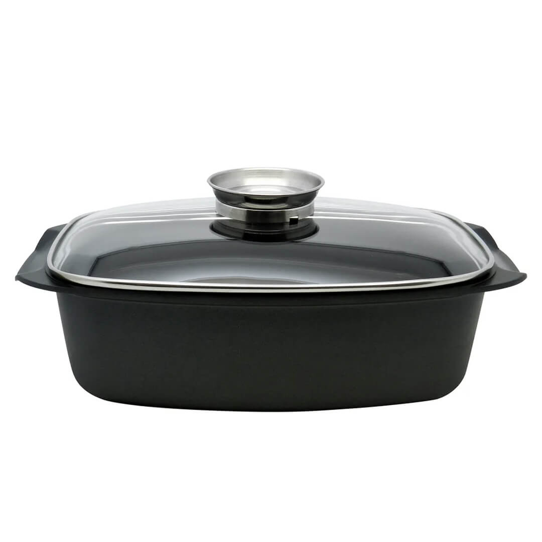 Kozica oz. pekač je izdelan iz litega aluminija, ki zagotavlja izjemno toplotno prevodnost, enakomerno peko in dolgo življenjsko dobo. Površina je premazana z nelepljivo PTFE prevleko (brez PFAS), ki je odporna proti praskam in omogoča kuhanje z malo ali brez maščobe. Pekač je opremljen z odpornim steklenim pokrovom z robom iz nerjavečega jekla, kar povečuje njegovo trpežnost in omogoča spremljanje priprave jedi. Aromatski ročaj na pokrovu je namenjen direktnemu dodajanju tekočine tudi med kuhanjem (jušna osnova, voda, vino), brez potrebe po dvigovanju pokrova. Tako lahko jedi med kuho oz. peko postopno aromatizirate in ohranjate njihovo sočnost. Dno skrbi za optimalno in enakomerno porazdelitev toplote, zato je posoda primeren za vse vrste kuhalnih površin, vključno z indukcijo.