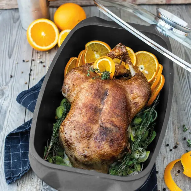 Pekač lahko uporabljate v pečici do 240 °C (s pokrovom do 180 °C) in ga brez skrbi pomijete v pomivalnem stroju.