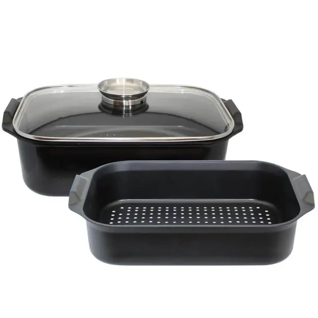 Kozica oz. pekač je izdelan iz litega aluminija, ki zagotavlja izjemno toplotno prevodnost, enakomerno peko in dolgo življenjsko dobo. Površina je premazana z nelepljivo prevleko (brez PFAS), ki je odporna proti praskam in omogoča kuhanje z malo ali brez maščobe. Pekač je opremljen s perforiranim vložkom iz ogljikovega jekla, ki je namenjen kuhanju na pari ali ločevanju hrane, steklen pokrov z robom iz nerjavečega jekla pa omogoča spremljanje priprave jedi. Aromatski ročaj na pokrovu omogoča direktno dodajanje tekočine v posodo tudi med kuhanjem (jušna osnova, voda, vino), brez potrebe po dvigovanju pokrova. Tako lahko jedi med kuho oz. peko postopno aromatizirate in ohranjate njihovo sočnost. Dno skrbi za optimalno in enakomerno porazdelitev toplote, zato je posoda primeren za vse vrste kuhalnih površin, vključno z indukcijo. Pekač lahko uporabljate v pečici do 240 °C (s pokrovom do 180 °C) in ga brez skrbi pomijete v pomivalnem stroju.