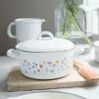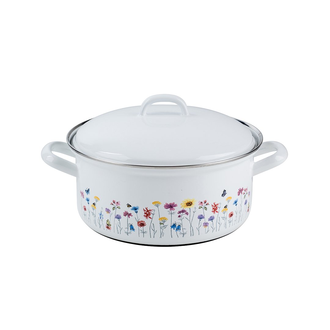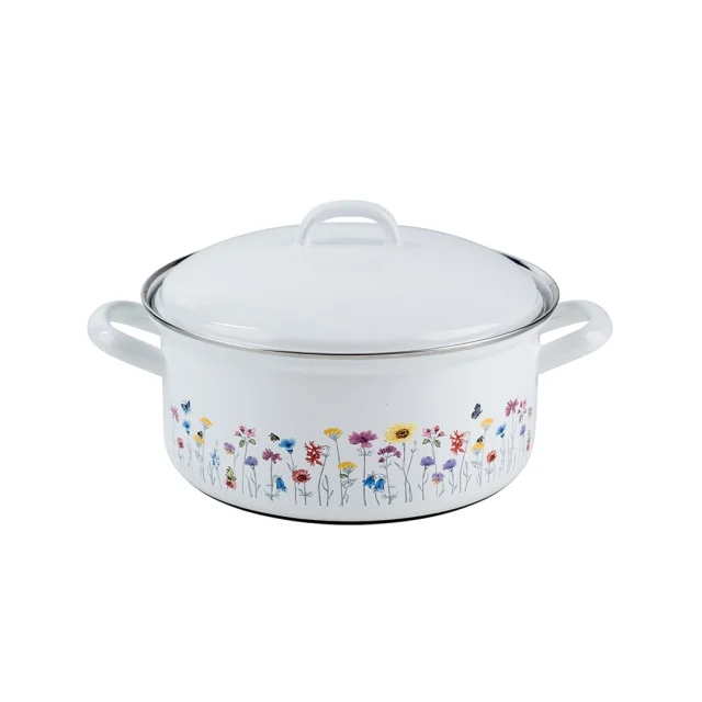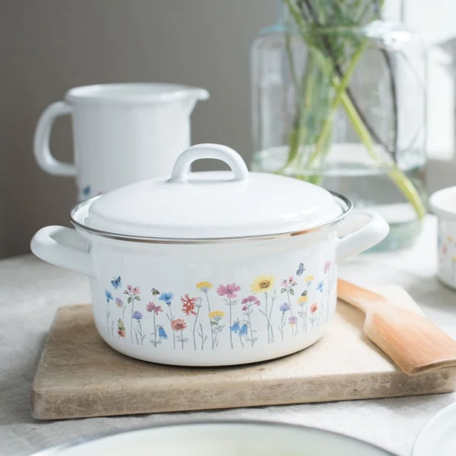 Klasična oblika emajlirane kozice s pokrovom Flora (16 cm) navdušuje z enostavno obliko ter izjemnim cvetličnim dekorjem. Vrh kozice zaključuje robusten kromiran rob. Priložen pokrov deluje kot kontrolor energije: takoj ko začne ropotati, je čas, da zmanjšate toploto in s tem prihranite energijo. Glede na vrsto štedilnika se lahko približno 5 minut pred koncem kuhanja štedilnik popolnoma izklopi, saj emajl dolgo časa ohranja toploto. Uporabite jo lahko na vseh štedilnikih (plinski, električni, steklokeramični, indukcijski in celo na odprtem ognju). Zahvaljujoč jedru iz železa se toplota hitro prevaja in nato shrani: za trajnostno, energijsko varčno kuhanje. Prednost emajliranih ročajev je v tem, da za ohranjanje toplote, posodo mirno lahko postavite tudi v pečico. Priporočamo, da pri dviganju kozice in pokrovov uporabljate debele prijemalke za lonce, saj se emajlirani ročaji med kuhanjem segrejejo in ravno tako ohranjajo temperaturo. Popolno higieno zagotavlja gladka steklena površina brez por. Le-ta ne vpliva na okus, zavira razmnoževanje mikroorganizmov in je poleg tega enostavna za čiščenje. Ob pravilni uporabi in ustrezni negi bo posoda iz emajla zdržala dolgo časa in ohranila svoj tipičen sijaj. Primerna je za pomivanje v pomivalnem stroju. Emajl kot material je sestavljen iz železa, ki se pri visoki temperaturi spoji s steklom, torej je iz naravnih surovin. Preverite še ostalo ponudbo posode iz linije Flora.