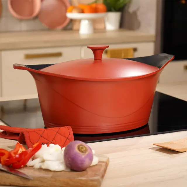 Ovalna kozica Incredible Cocotte je idealna za pripravo jedi za 8 do 14 oseb (9l). Njena velika prednost je njena teža, saj je 4-krat lažja od tradicionalne posode. Tehta samo 2,4 kg, zato je zelo priročna in enostavna za vsakodnevno uporabo. »Čarobna« posoda omogoča vse vrste kuhanja zahvaljujoč številnim dodatkom. V kombinaciji s pokrovko lahko počasi kuhate in dušite jedi, kot so blanquette, boeuf bourguignon ali osso bucco. Debela podlaga iz visokokakovostne aluminijeve zlitine zagotavlja popolno porazdelitev toplote in okusno pripravo. Združljiva je z vsemi vrstami kuhalne površine. Uporablja se lahko za plinsko, steklokeramično, indukcijsko, električno kuhanje in celo v pečici do 240°C. Pod pokrovom so konice oz. jamice, ki med kuhanjem zbirajo paro in jo v kapljicah vračajo v posodo - jed se kuha v lastnem soku, zato je okusnejša in mehkejša. Stranska ročaja nudita stabilen oprijem in služita kot naslon za žlico ali kuhalnico. Kozica Incredible Cocotte je izdelana iz naravnih materialov - litega aluminija s 100% mineralno in naravno prevleko proti prijemanju, ki ne predstavlja zdravju škodljivih snovi. Prevleko pridobijo z vitrifikacijo pri visoki temperaturi glavne sestavine peska (silicijevega dioksida) in vode, zato je popolnoma nestrupena, saj ne vsebuje nobenih organskih produktov na osnovi nafte: brez PFOA, PTFE, svinca, kadmija in niklja. Tudi pri visokih temperaturah lahko v kozici kuhate varno še leta. Priporočamo ročno pomivanje.
