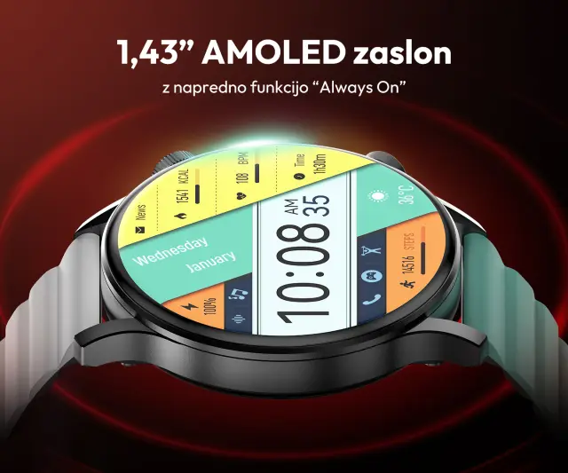 1,43“ Full HD AMOLED – najboljša ločljivost (466x466px) in svetlost (1000 nitov), ter napredna funkcija „Always On Display“.