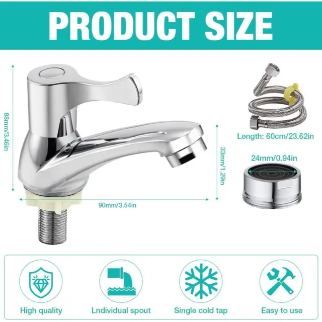 Hitra namestitev in uporaba: Ta pipa s 4-točkovnim hitrim odpiranjem, zasnovana za udobje, poenostavlja namestitev in vsakodnevno uporabo. Njena standardna velikost priključka zagotavlja združljivost z večino nastavitev umivalnikov, kar omogoča preprost in enostaven postopek montaže. Mehanizem za hitro odpiranje zagotavlja takojšen dostop do vode, odpravlja čakanje in povečuje učinkovitost vaše kopalniške rutine. Ne glede na to, ali si umivate roke ali polnite posodo, takojšen odziv te enojne pipe za hladno vodo nudi neprimerljivo enostavnost. Uživajte v funkcionalnem in uporabniku prijaznem dodatku k svojemu umivalniku, pripravljenem za delovanje od trenutka, ko je nameščen. Priloženi filtrirni zasloni prispevajo tudi k enostavnemu vzdrževanju in izboljšani kakovosti vode.