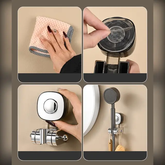 Močna dvojna pritrditev: Dvojni sesalni sistem je zasnovan za dolgotrajno in zanesljivo pritrditev na gladke površine, kot so ploščice, steklo ali kovinski elementi. Dve sesalni plošči zmanjšata nihanje med tuširanjem in izboljšata stabilnost držala za ročne ter nadglave tuše. Visokokakovostni ABS z elektrokromirano oblogo zagotavlja odpornost proti koroziji in eleganten srebrno-siv videz, kar ohranja estetsko usklajenost kopalnice ob intenzivni vsakodnevni uporabi brez poškodovanja stene.