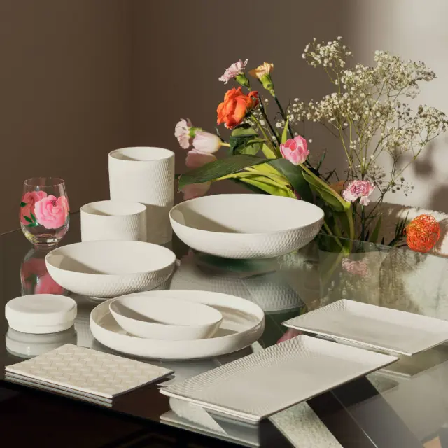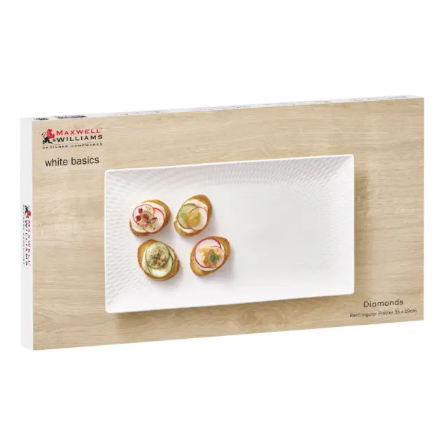 Servirni krožnik Diamonds dimenzije 35 x 19 cm je namenjena postrežbi sladic, sadja in ostalih prigrizkov (finger food). Nežna bela barva s prefinjeno površinsko strukturo, ki spominja na diamante, bo popestrila vsako mizo. Izdelan je iz kakovostnega porcelana odpornega na temperaturo in primernega za vsakodnevno uporabo. Lahko ga postavite v mikrovalovno pečico in pomijete v pomivalnem stroju. Dopolnite ga še z ostalimi izdelki iz iste linije Diamonds, prestižne blagovne znamke Maxwell&Williams.
