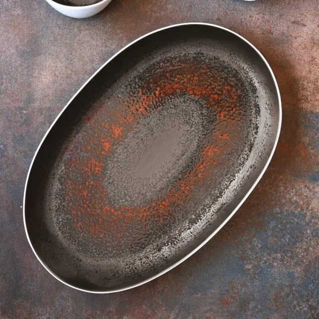 Ovalen krožnik iz linije Estia Rust, blagovne znamke Le Coq Porcelaine, meri 47,5 x 27 cm in je izdelan iz kakovostnega porcelana. Linijo navdihujejo simboli boginje Hestije (ognjišče in živi plamen), ki se odražajo predvsem v oblikah in toplih odtenkih te kolekcije porcelana. Oranžno-rjasta dekoracija naredi vsak predmet v zbirki edinstven in neponovljiv. Linija velja za najvrednejši porcelanasti izdelek, ki ga odlikujejo odpornost, trdota in prosojnost. Porcelan gre skozi dve različni stopnji žganja, v drugi temperatura preseže 1300 °C. Krožnik je primeren za uporabo v mikrovalovni pečici in pomivanje v pomivalnem stroju. Idealen je za profesionalno pa tudi domačo uporabo. Kombinirajte ga še z ostalimi izdelki iz linije Estia Rust.