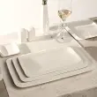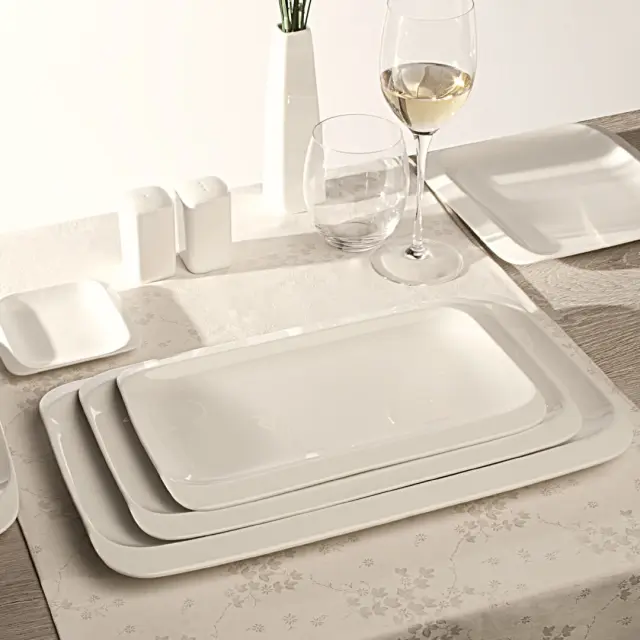 Pravokoten krožnik Infinity dimenzije 33,5 × 20 cm je sodoben in vsestranski kos porcelana, zasnovan z mislijo na eleganco in funkcionalnost. Izdelan je iz belega porcelana, ki je odporen na praske, udarce in vsakodnevno uporabo, hkrati pa ohranja čist, brezhiben videz tudi po številnih pomivanjih. Njegova gladka, minimalistična in oglata oblika se popolnoma ujema z značilnim dizajnom linije Infinity, kar doda moderen in prefinjen pridih vsaki mizi. Krožnik je idealen za serviranje glavnih jedi, prigrizkov, predjedi, sadnih in sladkih plošč. Primeren je za pomivanje v pomivalnem stroju in uporabo v mikrovalovni pečici.