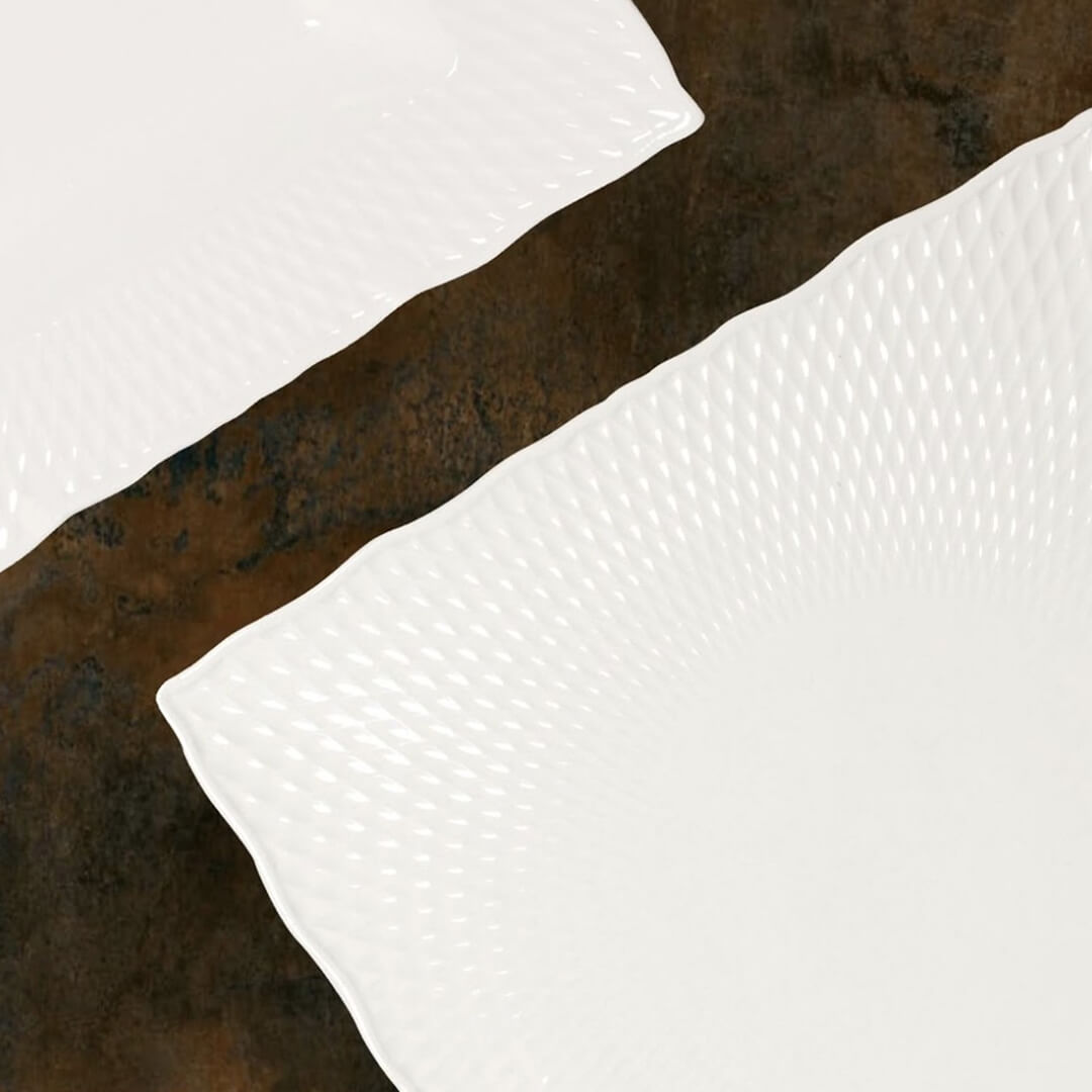Pravokoten krožnik iz linije Oniros dimenzij 25,5x17,5 cm, je navdahnjen z grškim božanstvom sanj s fascinantnim optičnim učinkom svetlobe in senc, ki ga ustvari hipnotična zasnova površine. Krožnik je izdelan iz porcelana Alumina. Gre za vrsto porcelana obogatenega z aluminijem, ki predstavlja 34 % vsebnosti aluminijevega oksida, kar poveča trdoto materiala in njegovo odpornost na udarce in praske, poleg tega pa ima izjemne mehanske in kemične lastnosti. Prenese zelo visoke temperature, zato je krožnik primeren za uporabo v mikrovalovni pečici in za pomivanje v pomivalnem stroju.