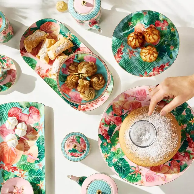 Servirni krožnik na podstavku Tropicana (28 cm), blagovne znamke Maxwell & Williams, prinaša pridih eksotične tropske narave na vašo mizo. Okrašen je z bogatim tropskim listjem in prelepimi ingverjevimi lilijami v živahnih odtenkih roza, modre in zelene, kar ustvarja popolno kulinarično predstavitev. Izdelan je iz kakovostnega porcelana z zlatim robom, ki združuje funkcionalnost in estetiko, saj je idealen za postrežbo tort, slaščic ali drugih dobrot. Njegov dvignjen podstavek doda pridih prefinjenosti in omogoča lažje serviranje ter eleganten prikaz vaših jedi. Pomijte ga ročno. NAMIG: Popestrite svojo mizo s kolekcijo Tropicana in uživajte v barvitih, naravnih motivih, ki prinašajo svežino in veselje v vsakdanji trenutek.
