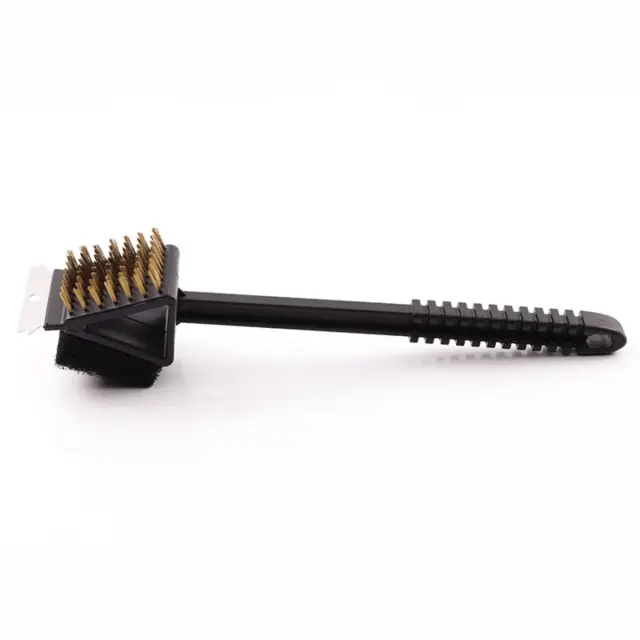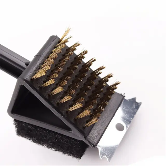 Bakrene žične ščetine: Ta žična krtača za žar, opremljena z bakrenimi žičnimi ščetinami, zagotavlja učinkovito strganje in ščetkanje trdovratnih delcev hrane in zažganih ostankov. Bakrena žična krtača za žar pomaga zrahljati umazanijo, hkrati pa zmanjšuje tveganje prekomerne abrazije v primerjavi s tršimi žicami, kar omogoča varno čiščenje običajnih materialov rešetk žara. Bakrena žična zasnova je idealna kot krtača za čiščenje žara in krtača za zunanji žar, saj uravnoteži agresivno čiščenje s skrbnim stikom s površino.