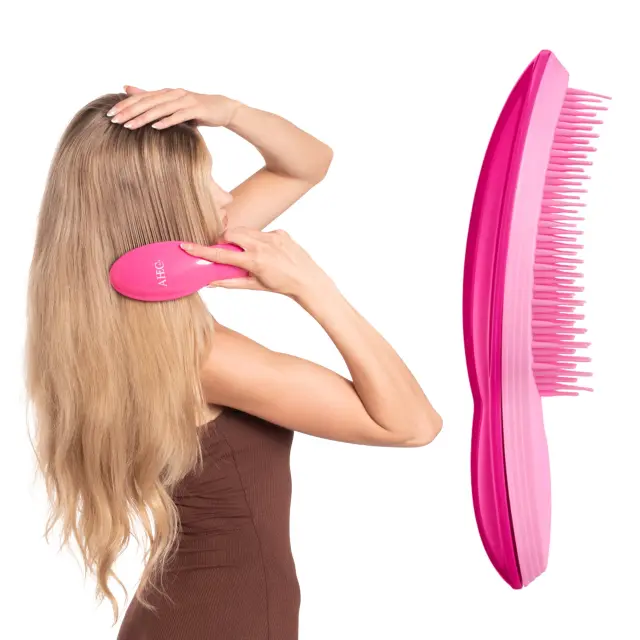 Rožnata krtača za lase AJK predstavlja nepogrešljiv pripomoček za vsakodnevno nego in razčesavanje vseh vrst las, še posebej tistih, ki zahtevajo posebno pozornost. Posebej zasnovane prilagodljive ščetine omogočajo nežno česanje suhih in mokrih las brez nepotrebnega vlečenja ali lomljenja lasnih vlaken. Ergonomska oblika se popolnoma prilagaja obliki glave, kar olajša uporabo ter hkrati nudi sproščujočo masažo lasišča. Ta krtača je idealna izbira za uporabnike s tankimi ali poškodovanimi lasmi, uporablja pa se lahko tudi na lasnih podaljških, lasuljah in afro pričeskah.