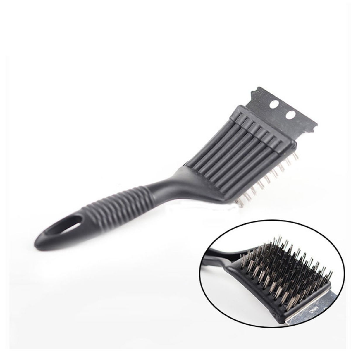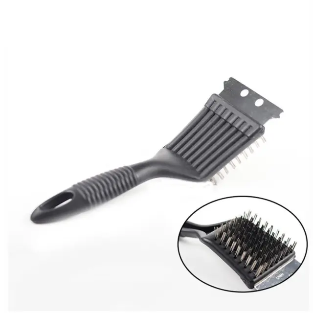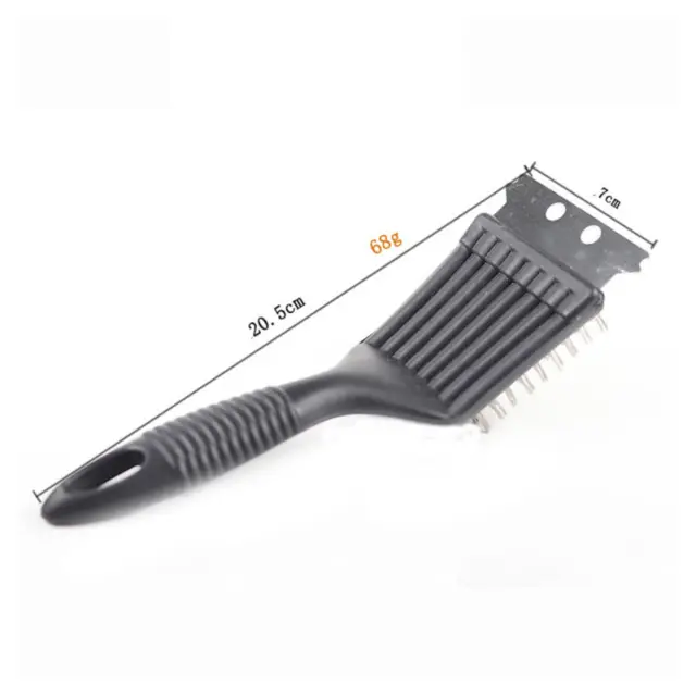 Učinkovito čiščenje: Ta krtača združuje gosto nerjaveče jeklene žične ščetine in vgrajeno strgalo za temeljito čiščenje rešetk žara. Ščetine odstranijo pečeni ostanek in pepel, medtem ko strgalo pripomore pri trdovratnih madežih. ABS ročaj omogoča dober oprijem in nadzor pri usmerjenem strganju ter ščetkanju, kar olajša redno vzdrževanje žara in samostojno odstranjevanje madežev brez posebnih orodij, hkrati pa ohranja površino rešetk.