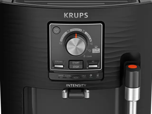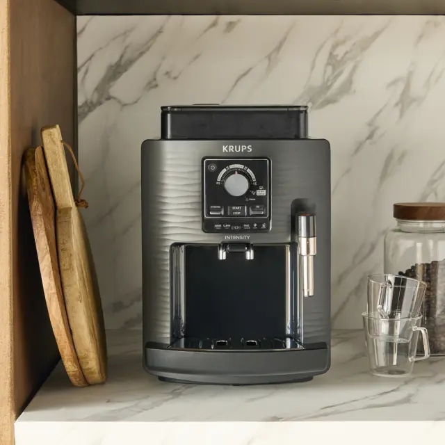 Krups Intensity EA5008 Noir je kompaktni avtomatski espresso aparat z vgrajenim mlinčkom, ki omogoča pripravo sveže mlete kave z enim pritiskom na gumb. Namenjen je uporabnikom, ki želijo enostavno pripravo kakovostnega espressa doma, brez zapletenih nastavitev.