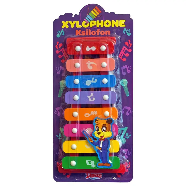 Ksilofon vsebuje 8 barvnih kovinskih ploščic in dve paličici. Velikost 26 cm. Pri otroku razvija občutek do glasbe. Primerno za otroke od 3 let.