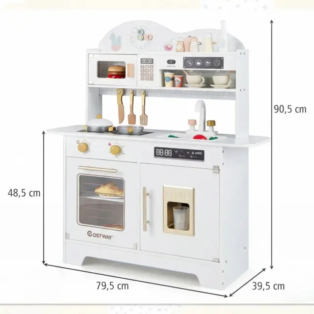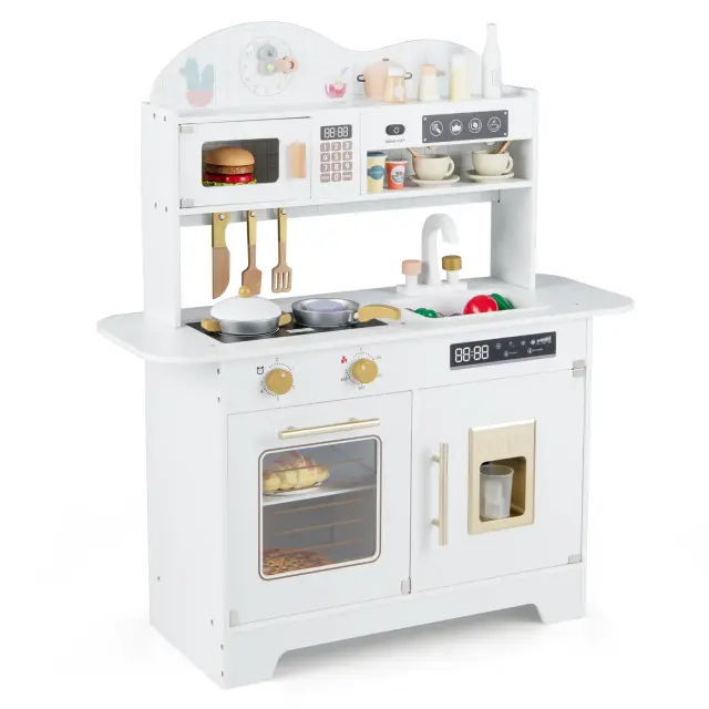 Ta otroška kuhinja je zasnovana za nadobudne kuharje, stare 3+, in ponuja poglobljeno kuharsko izkušnjo s funkcionalnim izdelovalnikom sladoleda in vrtljivimi gumbi, ki se slišijo kot prijetno klikanje. Na voljo je široka paleta realističnih kuhinjskih iger, od peke v pečici in segrevanja v mikrovalovni pečici do zamenjave stvari za čajne zabave s kavnim aparatom in shranjevanja v hladilniku. Na voljo je tudi veliko prostora za shranjevanje s stojalom za začimbe, delovno površino, omarico in kljukami, ki poskrbijo za urejenost in učijo organizacijskih spretnosti - idealno za družabno, ustvarjalno in izobraževalno igro.
