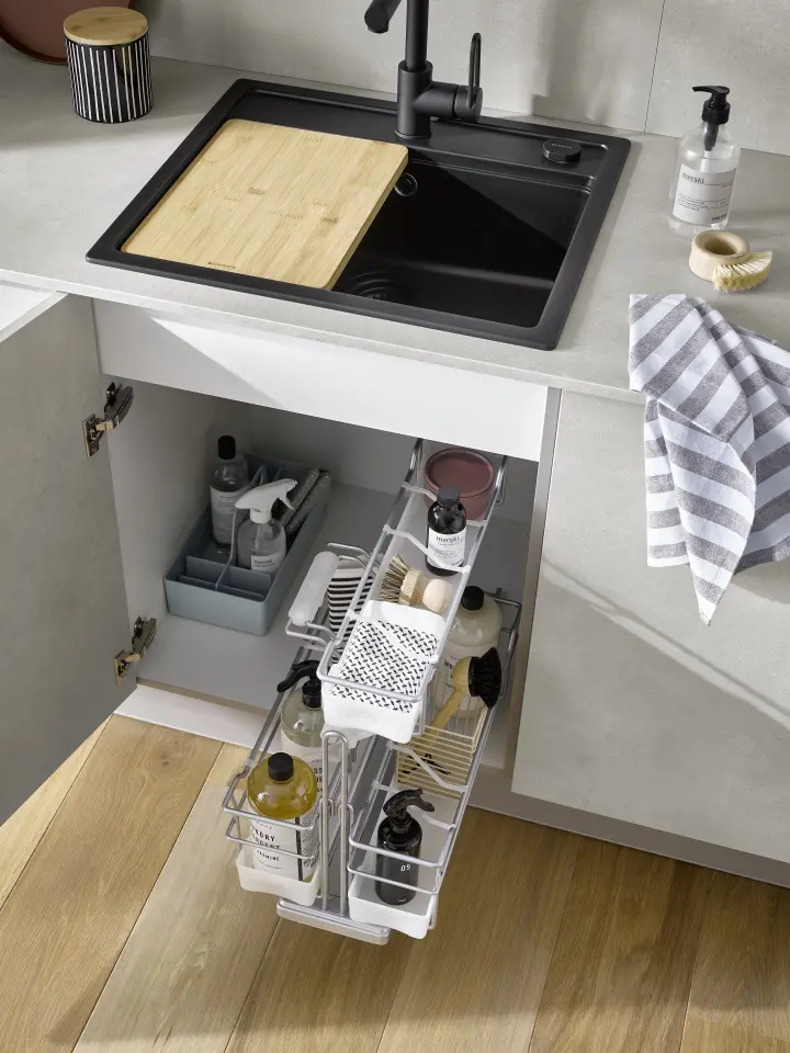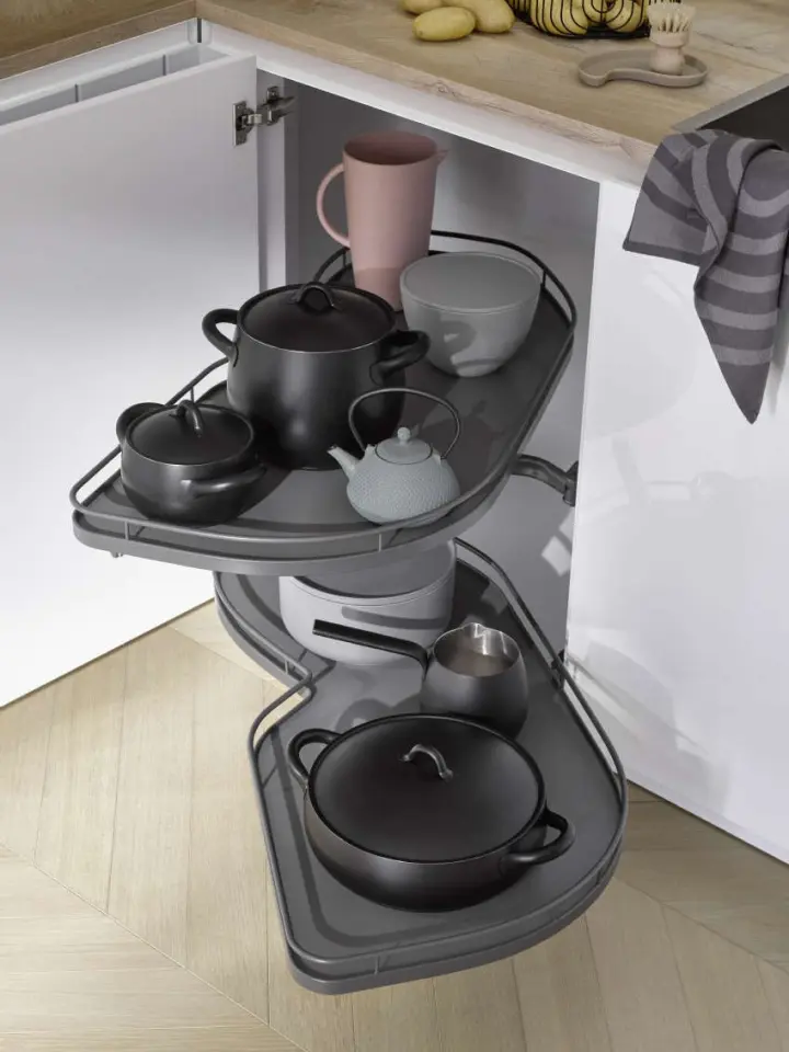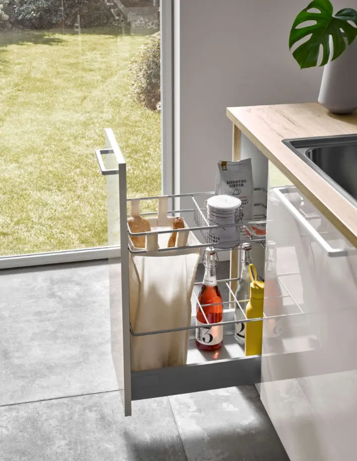 Kuhalna plošča z integrirano izvlečno napo in kavomat na izvlečni površini. Za vse, ki si želite, pa se rezalnik kruha lahko dvigne iz spodnjega predala. Tako priročno je lahko življenje.