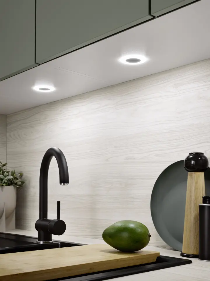 Ne glede na to, ali je hladna ali topla bela – ambientalno osvetlitev v kuhinji lahko enostavno nastavite na katero koli intenzivnost z daljinskim upravljalnikom. Mimogrede, lahko jo tudi sinhronizirate in popolnoma uskladite za enoten celoten vtis.